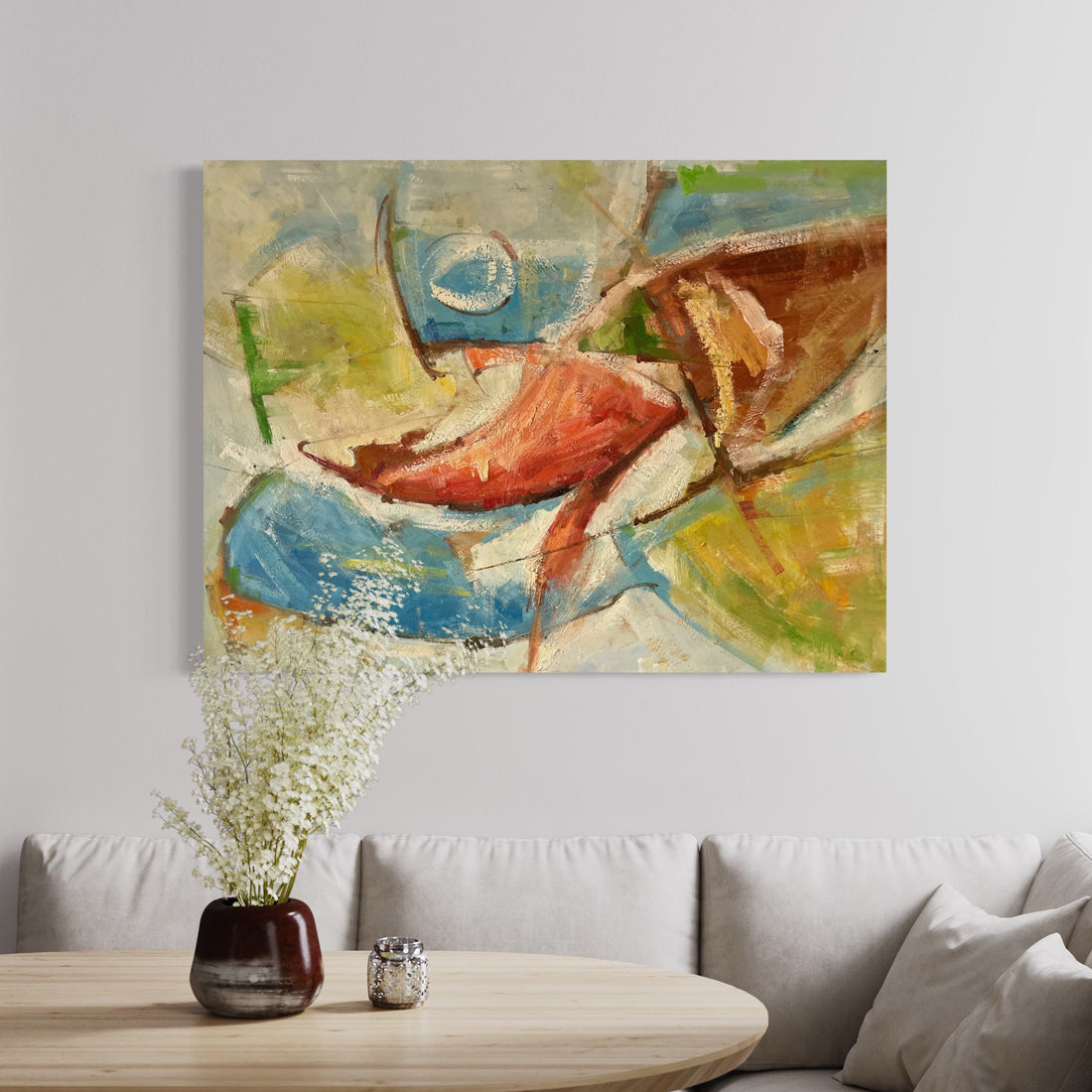 - Design Features/Shape/Style: Rectangular, framed in a simple, likely thin frame (or gallery – wrapped), abstract expressionist style with loose brushstrokes