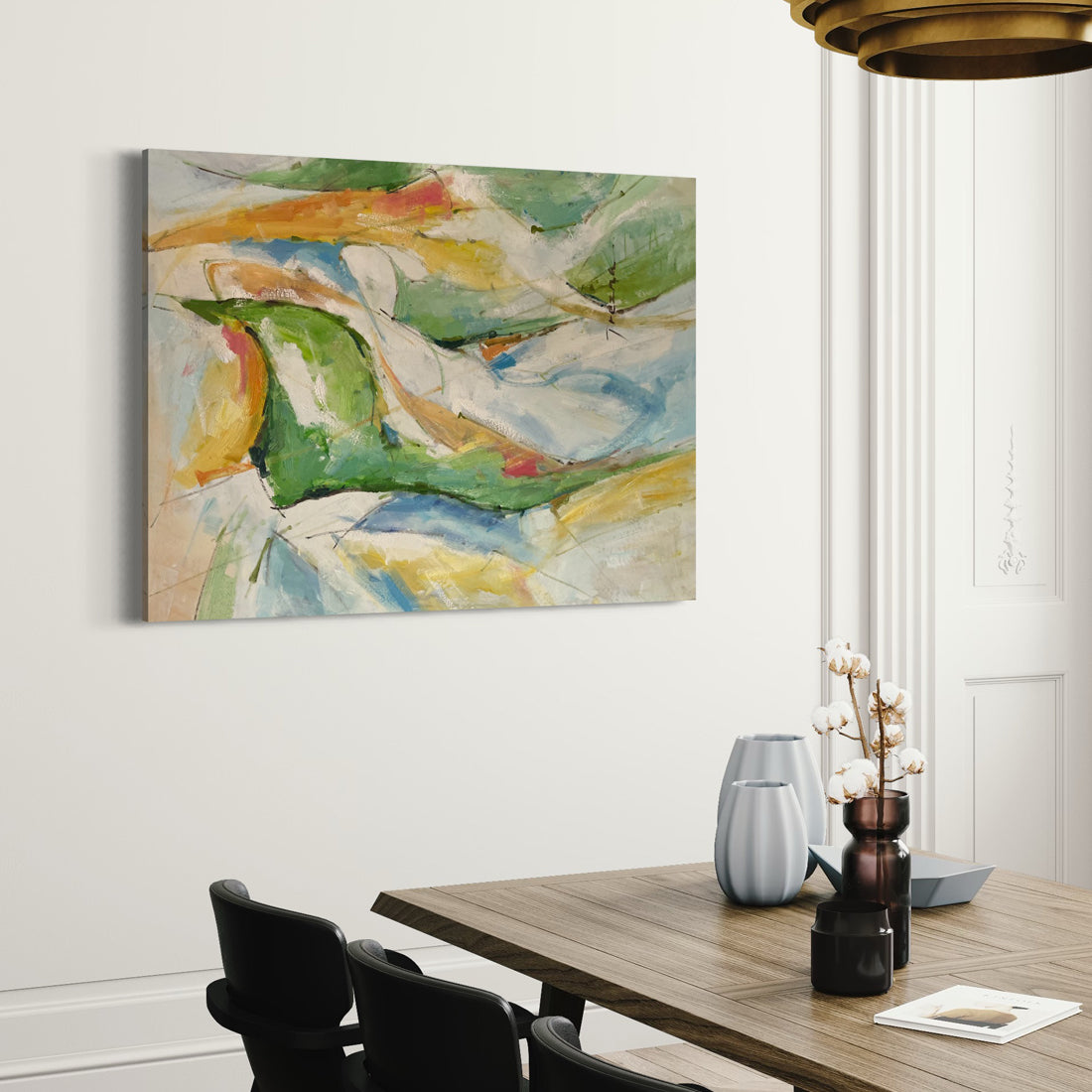 This painting is perfect for modern living rooms, offices, or any space that needs a statement decorative piece. It can be placed above a fireplace, on a large wall, or in an art gallery setting to create a visually impactful atmosphere.