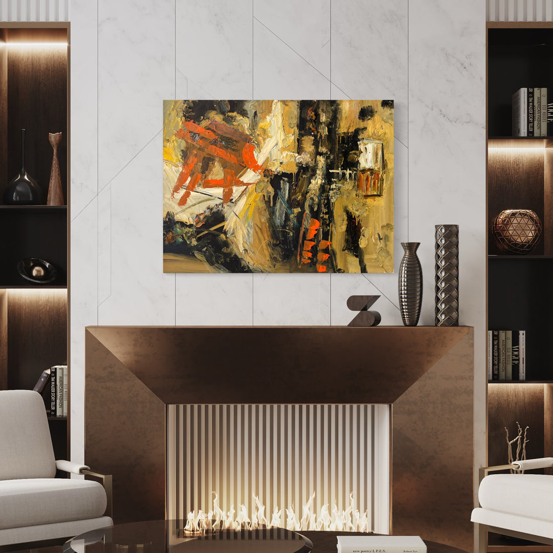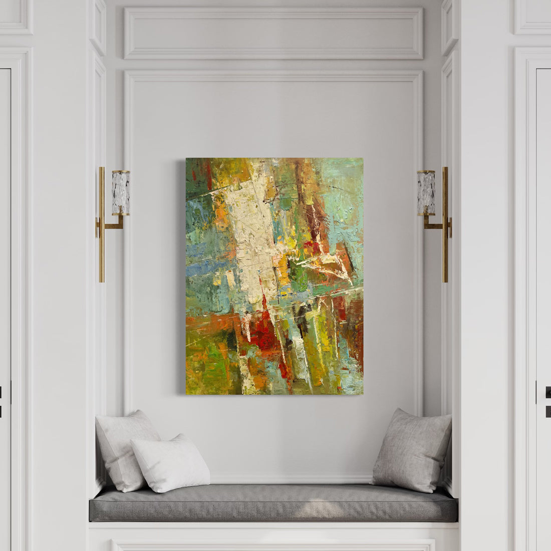 - Design/Style: Abstract, with organic, overlapping shapes and dynamic, fluid lines. No representational subject—instead, the composition evokes movement, natural forms (e.g., foliage, landscape), or emotional energy through color and texture. Brushstrokes are visible and expressive, emphasizing the artistic hand.