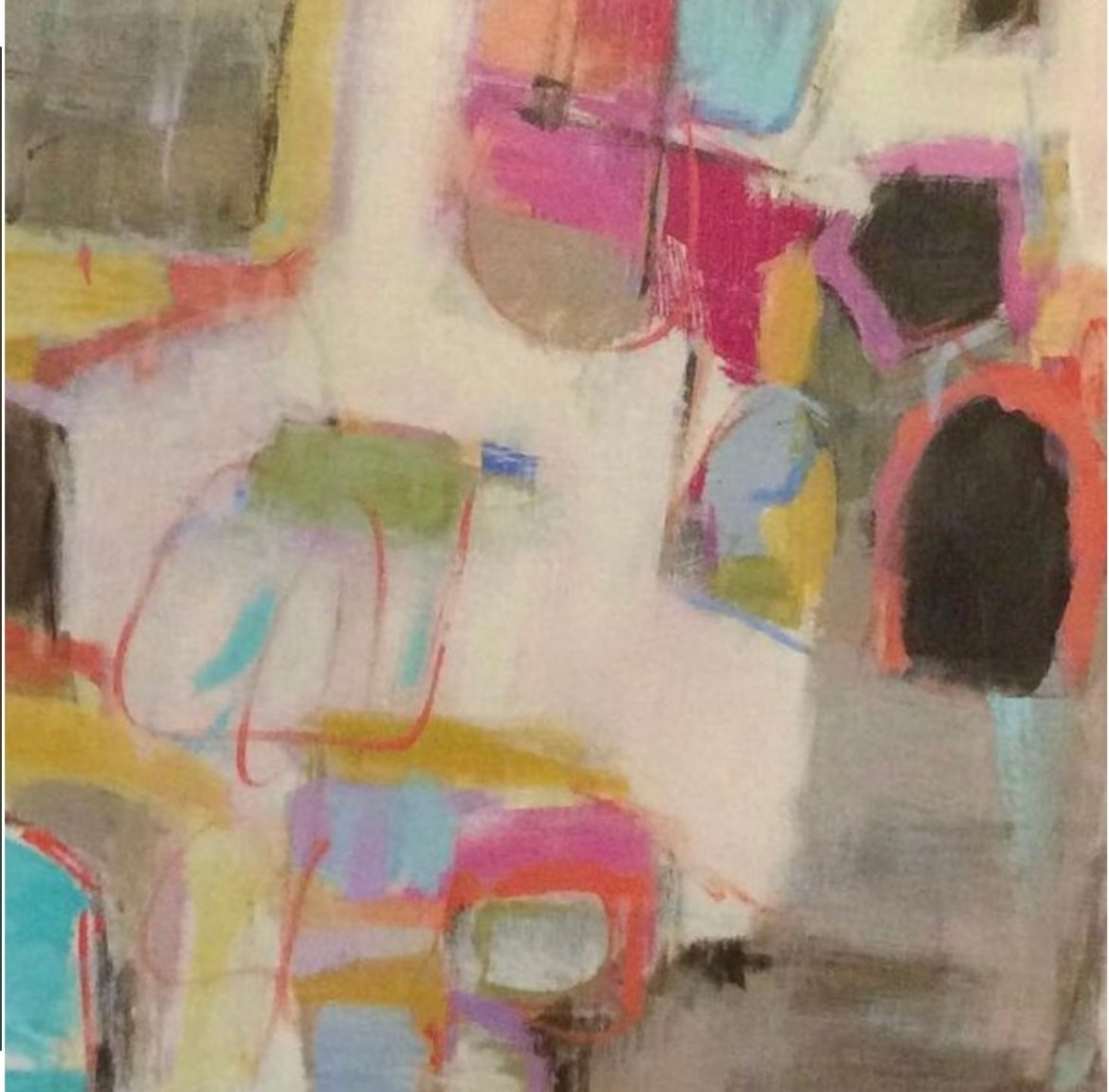 - Design/Style: Abstract expressionist, with fragmented shapes, vertical/horizontal blocks, and color fields. The composition is dynamic with central focal points.