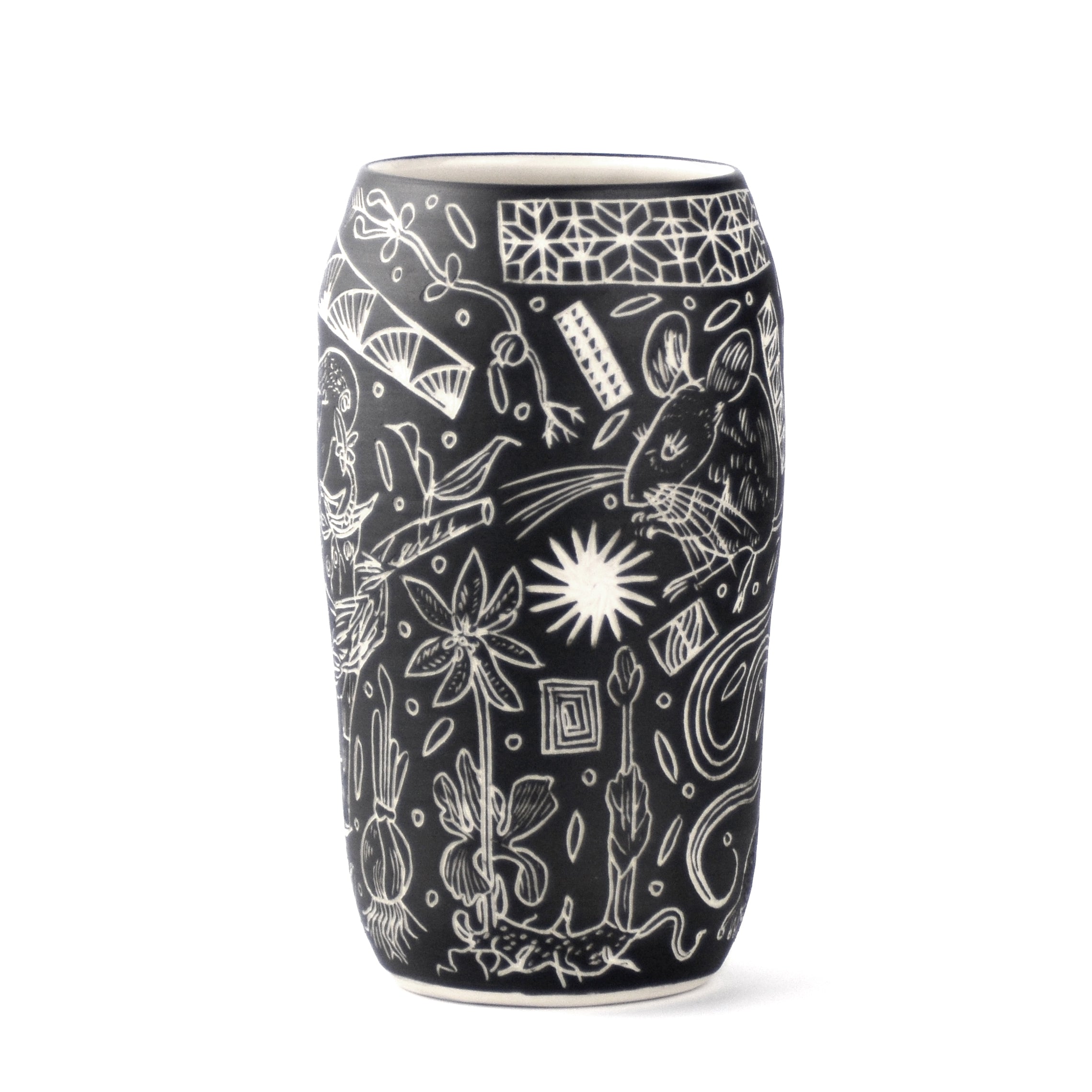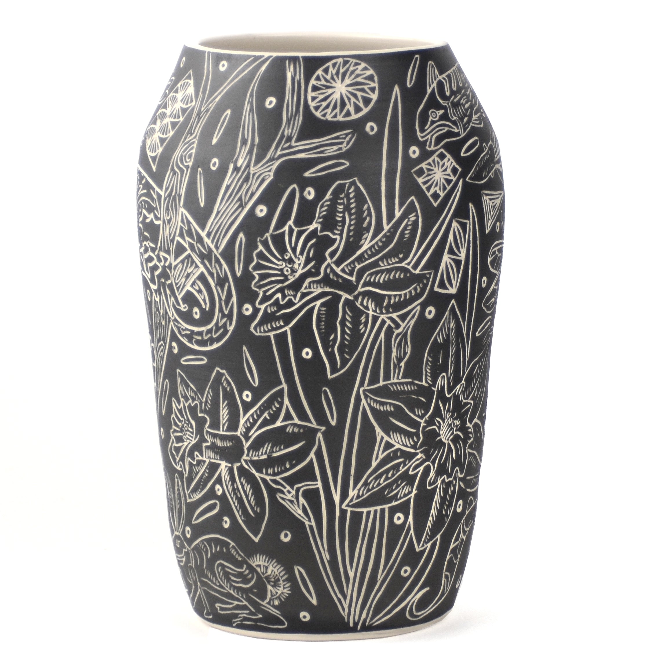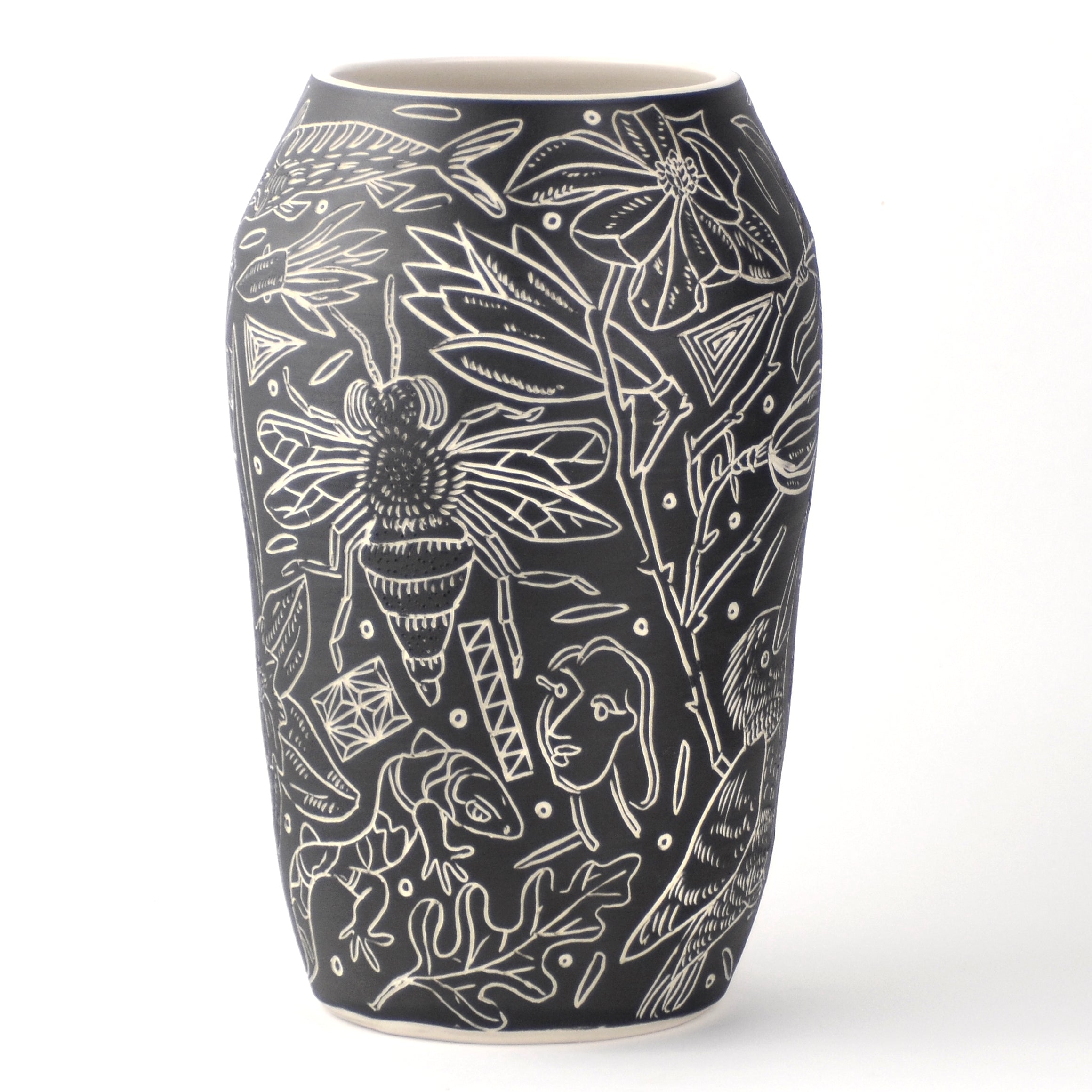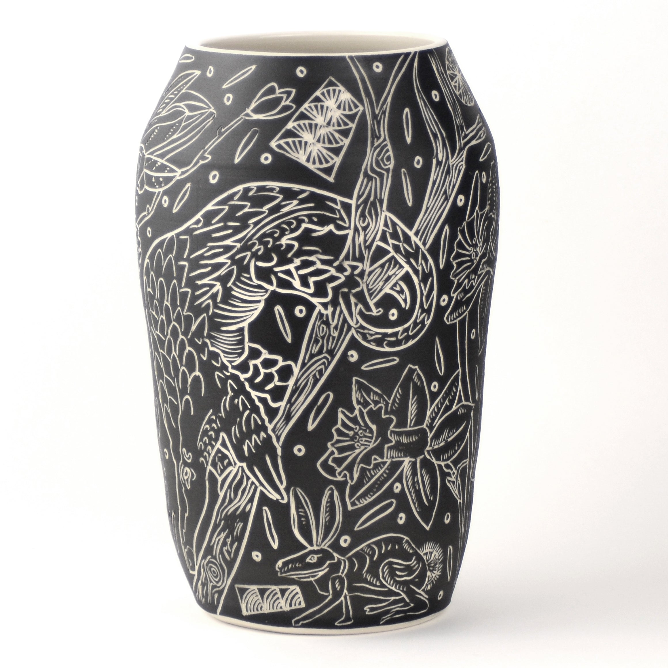 A large illustrated vase, hand thrown on the wheel using English Porcelain and carved with illustrated motifs.