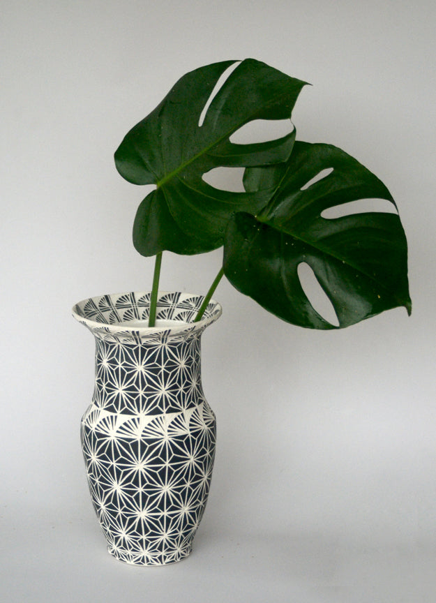This is a one of a kind piece of art. The freehand illustrated motifs are carved into the surface of the vase. Included images: microscope, Komodo dragon, snowdrops, bike, slug, seashell, magnolia branch, sea turtle, broken bone, armadillo, mackerel, amaryllis bulb,