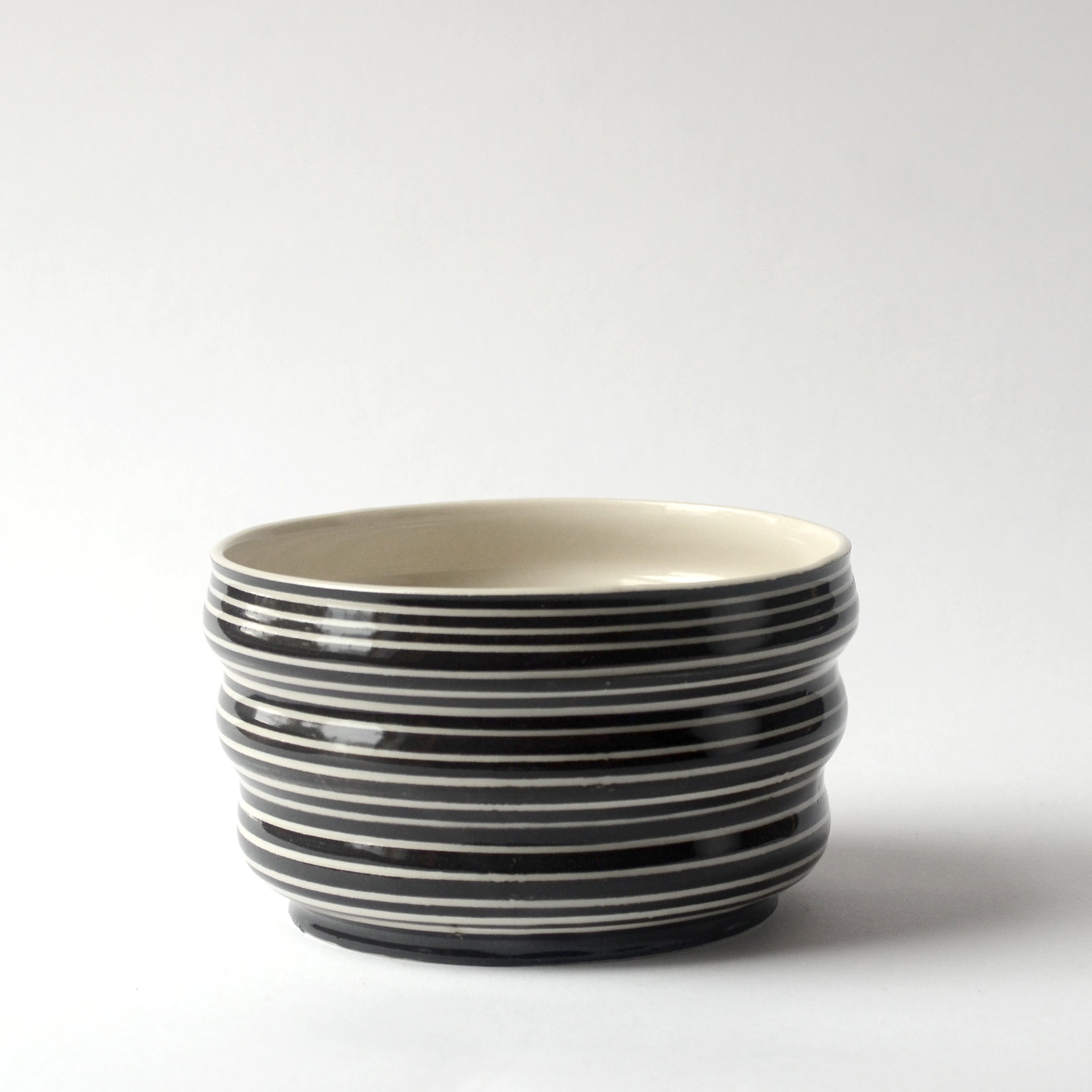 Two hand thrown english porcelain bowls. Decorated with illustrations of various fish from historic engravings and a geometric wave motif. Slightly different sizes but about the same capacity.