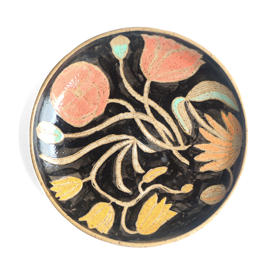 A hand thrown stoneware plate featuring floral motifs.