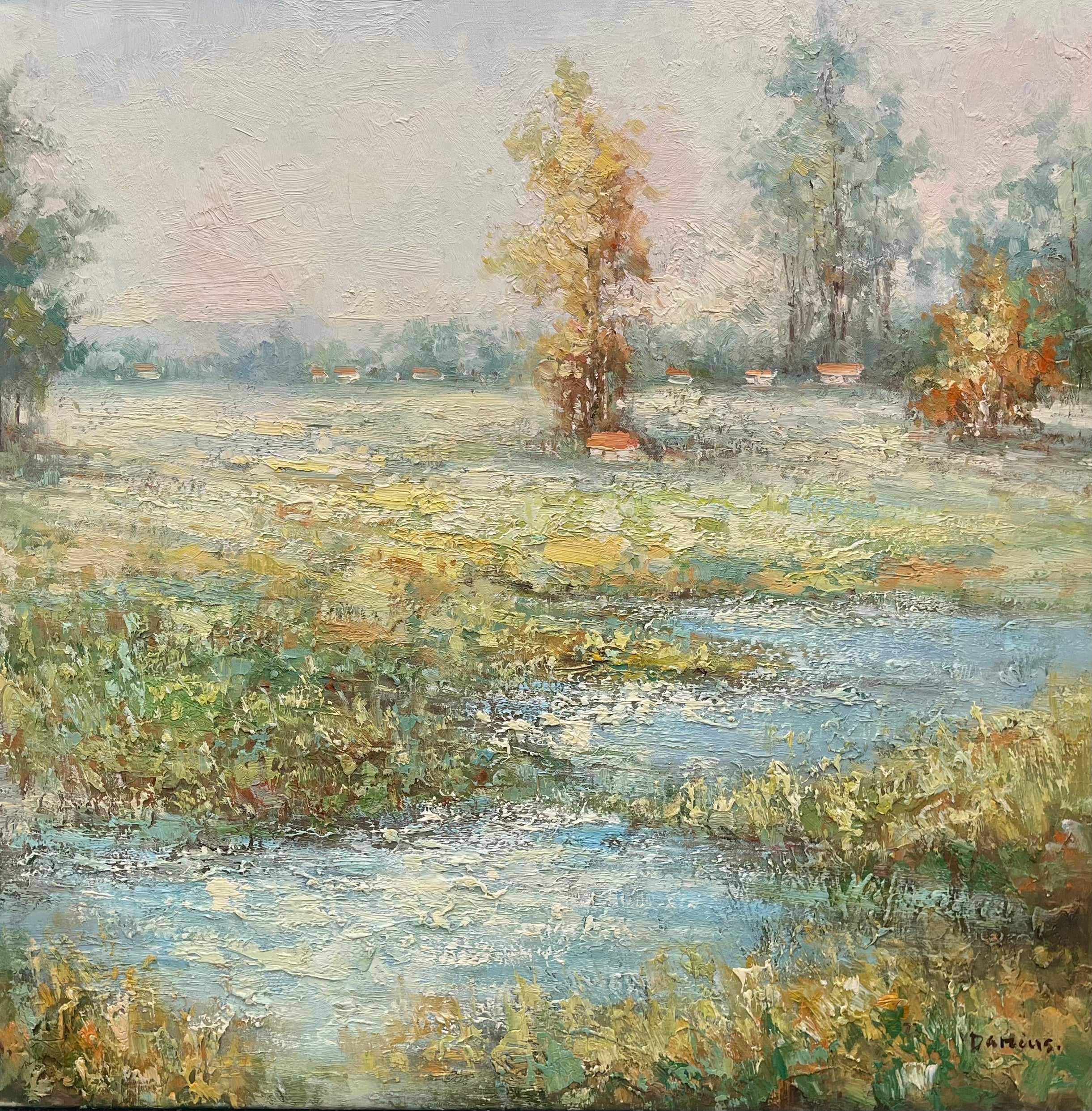 - Design/Style: Impressionistic landscape with a horizontal composition