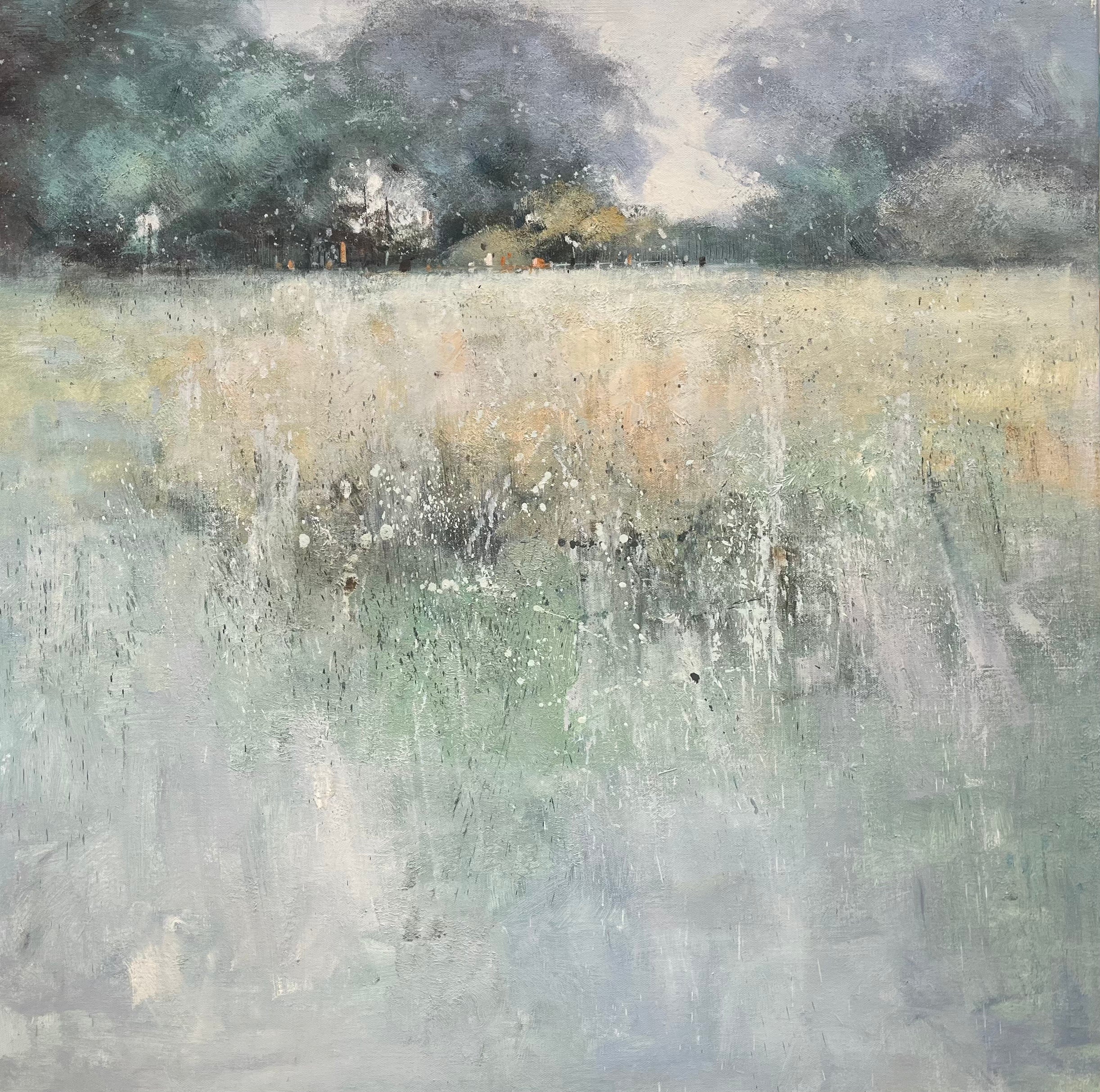 - Design/Style: Impressionistic, emphasizing light, atmosphere, and movement over precise details. The composition is horizontal, with the lower half dominated by water reflections, a central field, and distant trees/building.