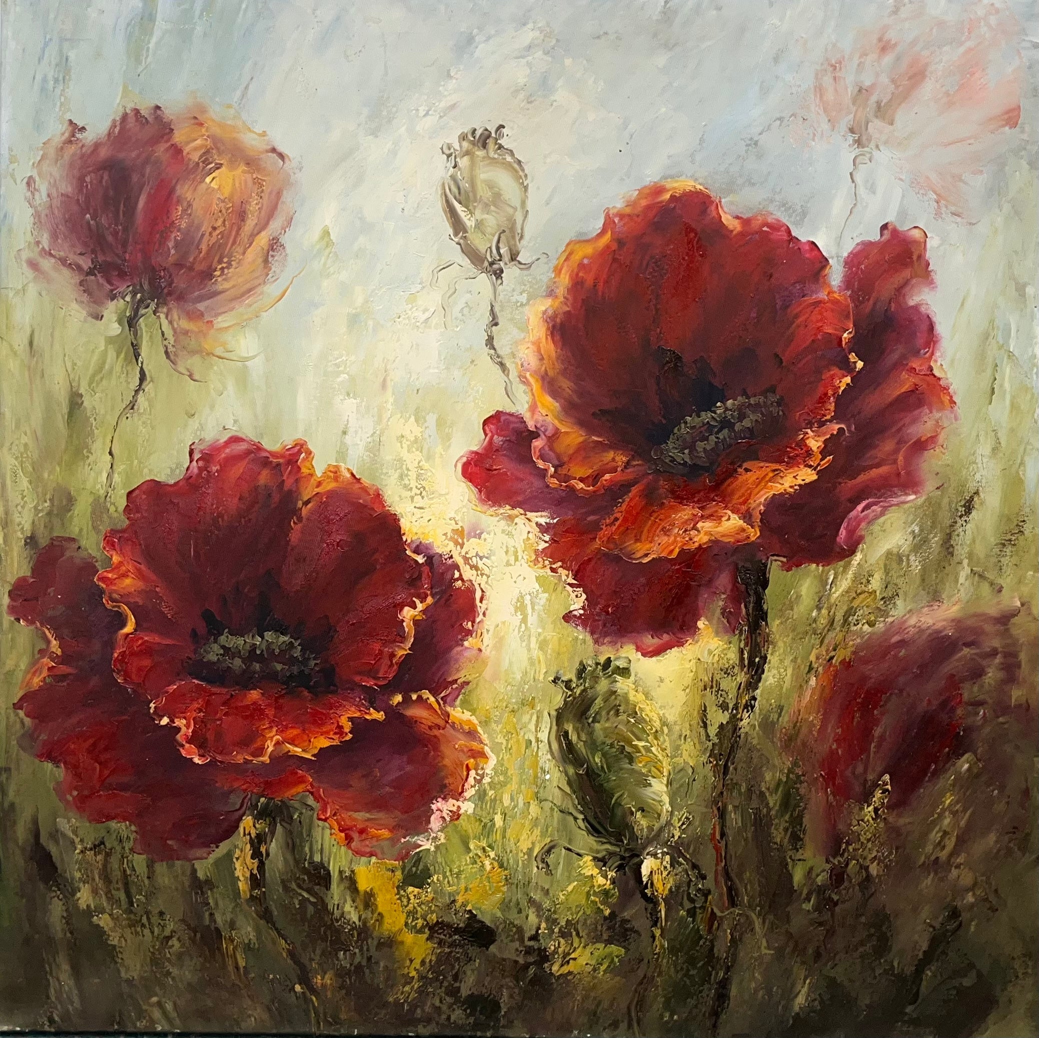 - Materials & Texture: Oil paint on canvas with impasto technique for a tactile, painterly feel