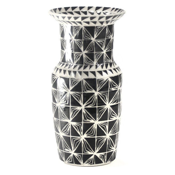 A tall hand thrown porcelain vase with a carved geometric pattern.