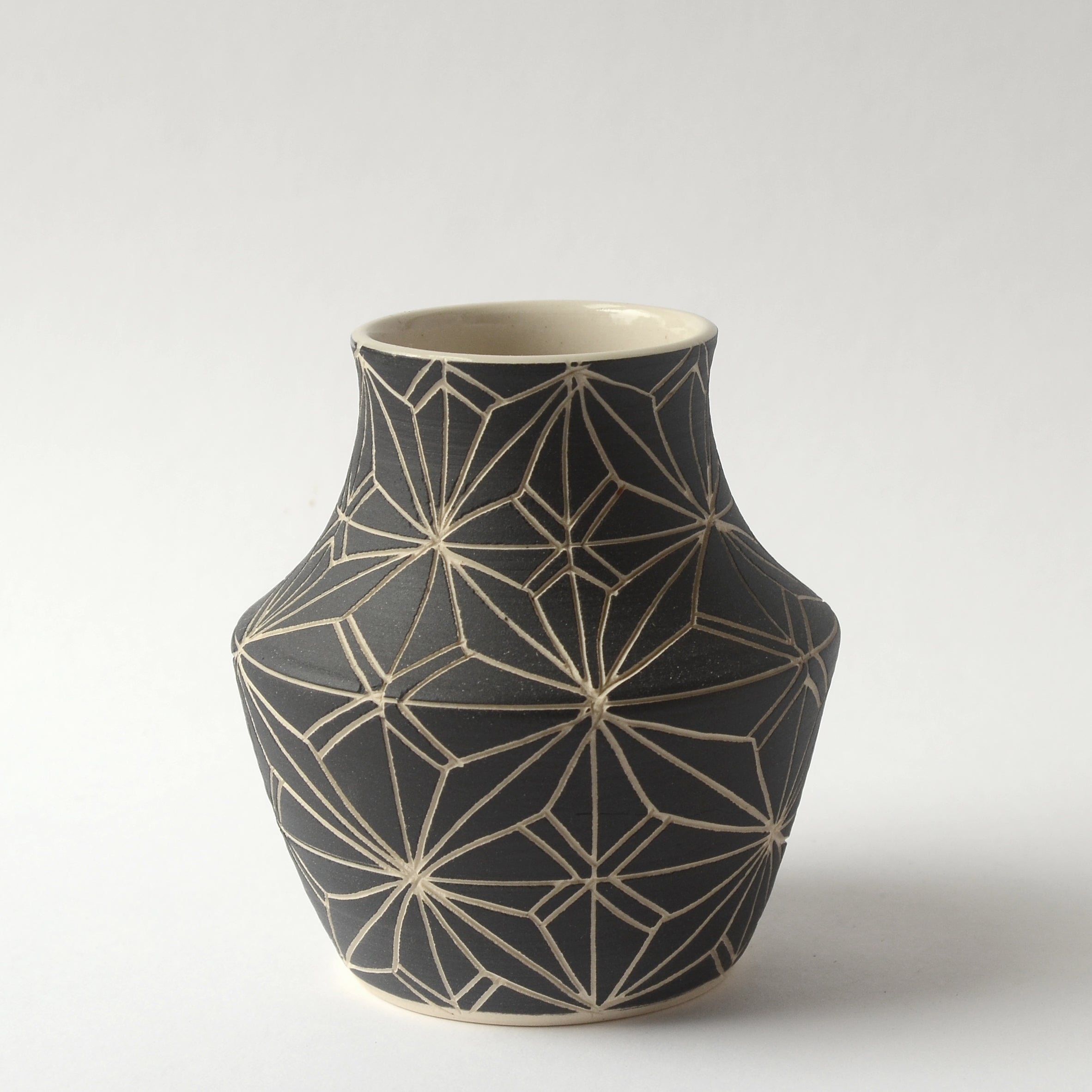 A white stoneware vase with a rough etched texture band on the outside. A fun departure from my usual work and quite elegant in it’s simplicity. These are designed for supported centerpieces for floral arranging but can be used for anything.